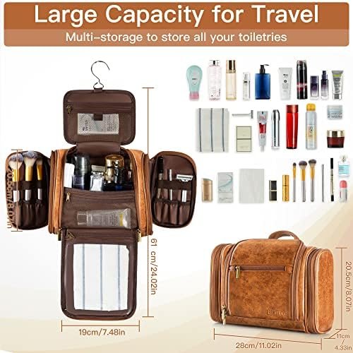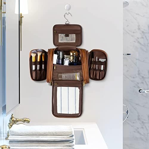 Elviros Travel Hanging Toiletry Bag for Women and Men, PU Leather Toiletries Organizer, Water-Resistant Bathroom Shaving Kit for Cosmetics, Makeup Case Brown Large