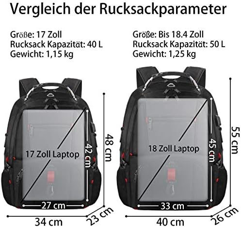 SUPER LARGE CAPACITY:3 spacious main multi compartments give excellent protection for a 18.4 laptop and tablet. Exterior size of the business travel backpack: 55*40*26(CM). Capacity: 55L. The laptop compartment is large enough to basically accommodate computers of 18 inches and below. Being your gifts for men, fathers, dads, grandfathers