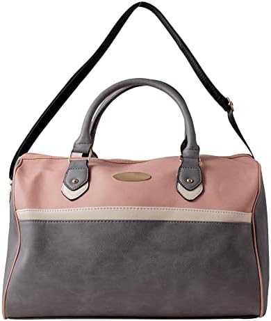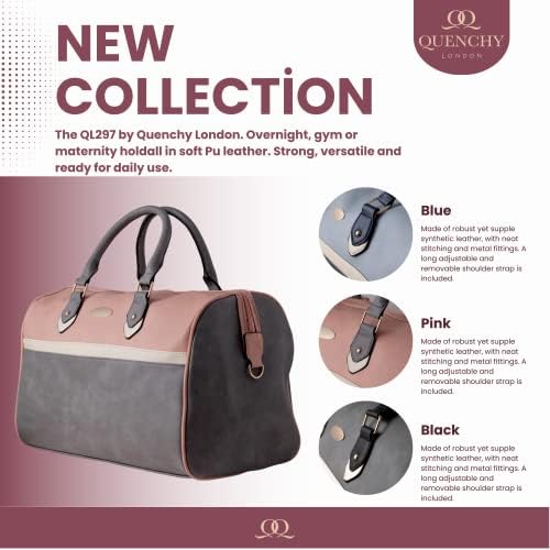Quenchy London Ladies Travel Holdall Handbag – Pu Leather Women’s Duffle Bag, 40cm x26 x24 – 25 Litre Grey Pink – QL297GYP