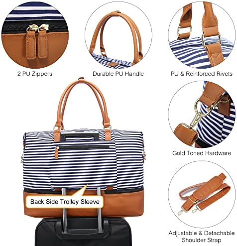 Sucipi Travel Bag Weekend Bag for Women Large Canvas & PU Leather Overnight Bag with Toiletry Bag & Shoes Compartment Holdall Hand Luggage Duffle Bag for Hospital, Blue Striped 50L