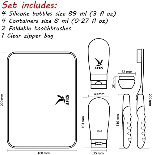 This beautiful set from AVES is all you need for your travel toiletries. The set consists of four silicone bottles, four small containers, two folding toothbrushes and a premium quality clear zipper bag.